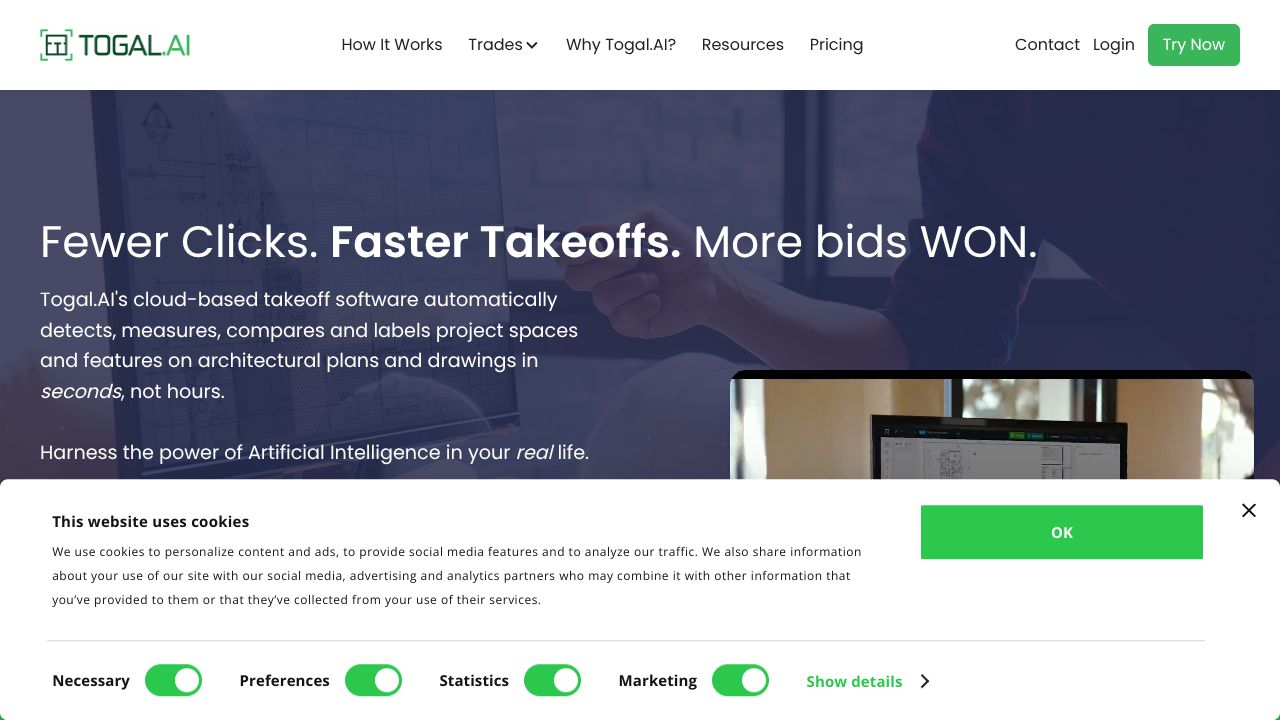 Construction firms analyzing blueprints manually spend an average of 6-8 hours per takeoff. Togal.AI's AI-powered automation reduces this to under 45 minut...